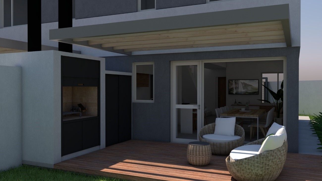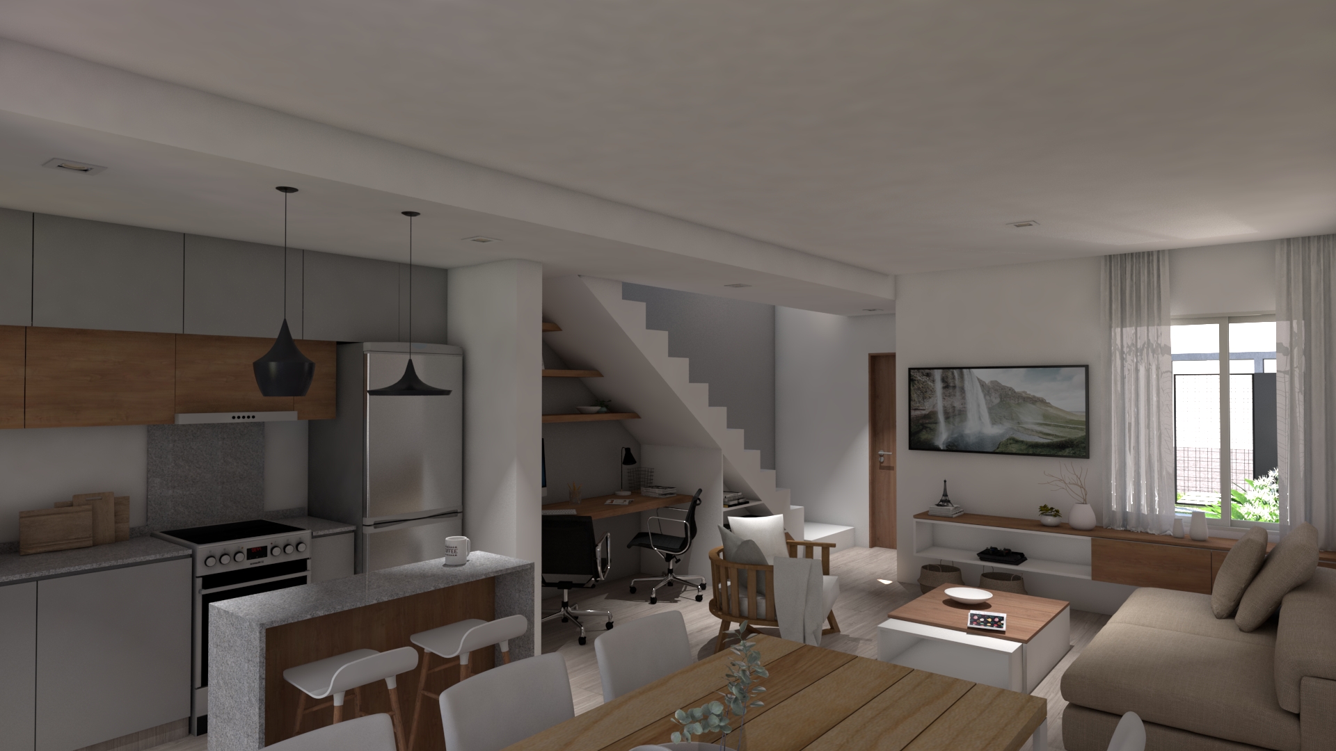 Planta baja: Living, comedor y cocina integrada, toilette con vanitory.