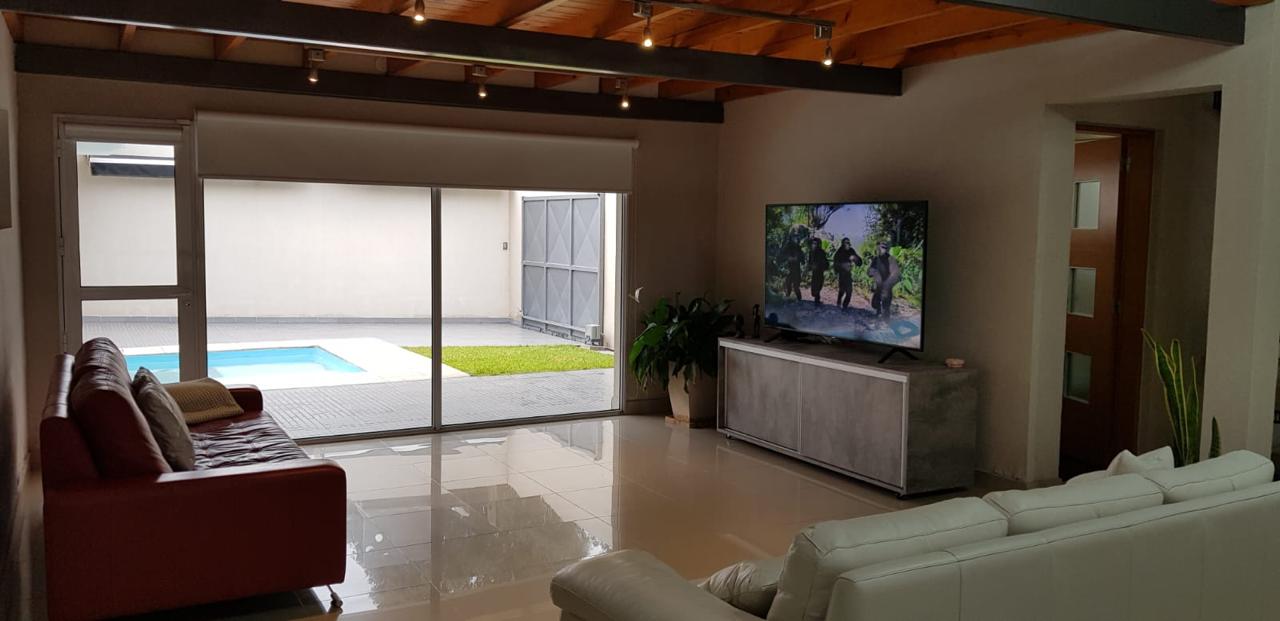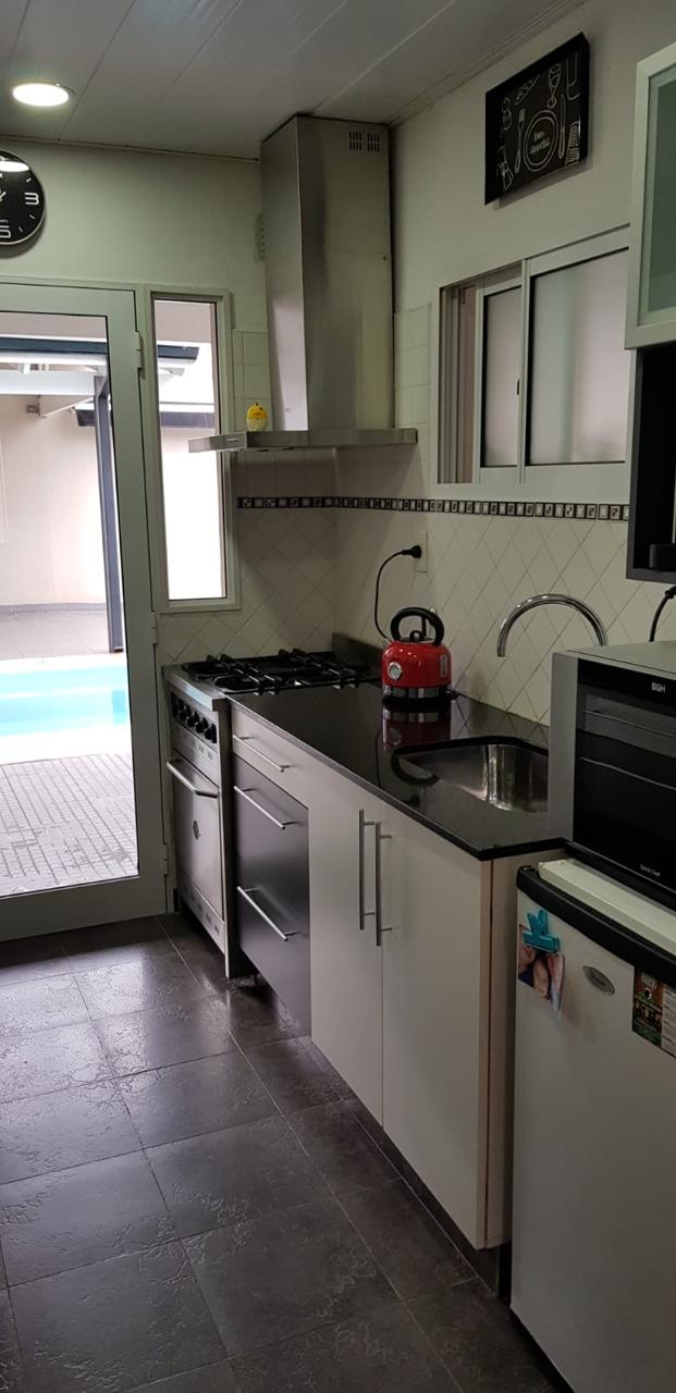 Exterior con piscina, fogón y portón eléctrico, ideal para disfrutar al aire libre. Además, incluye lavadero, garaje y sistema de alarma.
