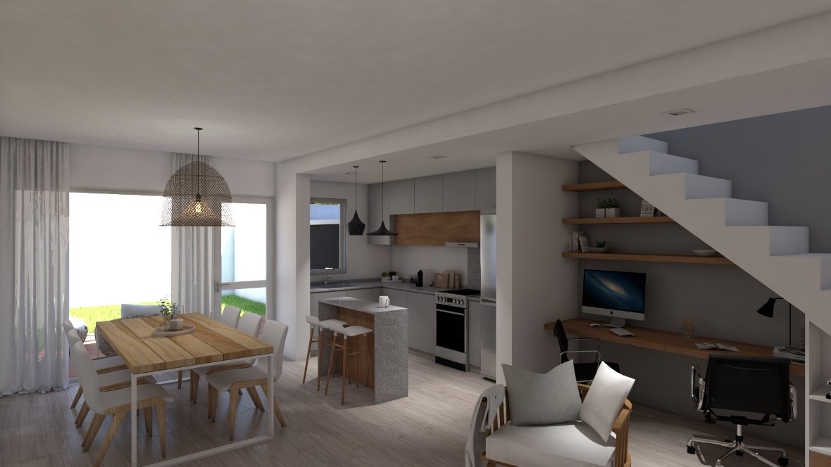 Planta baja: Living, comedor y cocina integrada, toilette con vanitory.